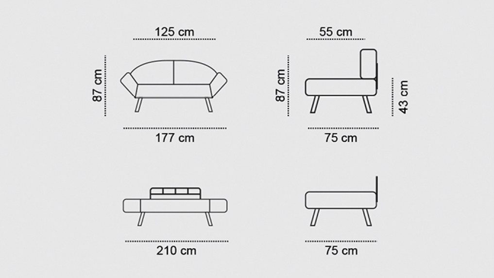 - Width: 177 cm, Height: 87 cm, Depth: 75 cm